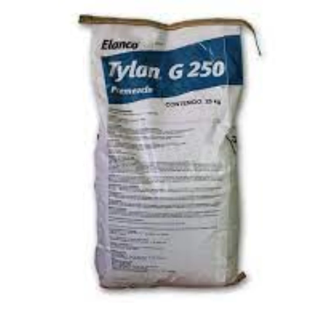 Dosagem: AVES – Frangos de Corte, Matrizes e Poedeiras – No tratamento da Doença Respiratória Crônica: administrar na dose de 44 a 55 mg de tilosina/kg de peso vivo do animal, ou seja, 3.520 a 4.400 g de Tylan G 250 Premix (equivalente a 880 a 1.100 g de atividade de tilosina) por tonelada de ração, durante 5 dias ou em outros períodos de estresse. Para o tratamento da Enterite Necrótica: administrar na dose de 5 mg de tilosina/kg de peso vivo do animal, ou seja, 400 g de Tylan G 250 Premix (equivalente a 100 g de atividade de tilosina) por tonelada de ração durante 7 dias consecutivos.